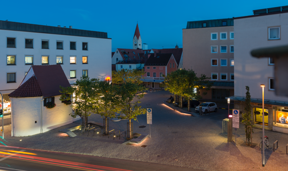 Bezugnehmend auf die historische Struktur in der direkten Umgebung um das Kemptener Tor wird der neue Stadteingang durch zonierende und raumbildende Baumelemente in Platzräume gegliedert, dabei tritt an die Stelle der Befestigungsanlage der begrünte und offen bebaute Bereich am Alleeweg. Der Platzbereich am ehemaligen Übergang von ‚innen‘ nach ‚aussen‘ wird als Erweiterung des Strassenraumes behandelt. Der ‚äussere‘ Platzraum ist die Auftaktfläche und der Vermittler für die unterschiedlichen Richtungen und Funktionen, wobei das historische Zollwärterhaus durch die Positionierung der neuen Raumbegrenzungen hervorgehoben wird. Die gliedernden Baumelemente erhalten in der Platzebene grosszügige Sitzelemente und Flächen als kommunikative Treff-, Spiel und Ruhepunkte unterhalb der im Sommer schattenspendenden Baumdächer.